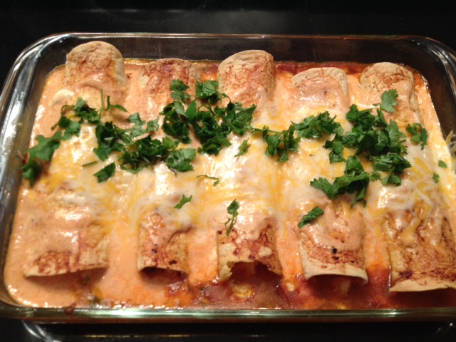 Mix together all filling ingredients. Roll mixture into tortillas and arrange in rows in a large baking dish. Cover with enchilada sauce and grated cheese. Bake at 400 degrees until cheese is melty.