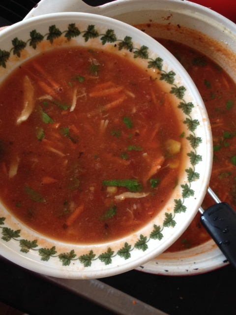 Heat oil in a heavy soup pot over medium-high heat. Add onion and garlic; sauté two minutes. Stir in chicken and next nine ingredients (corn through tomato soup); bring to a boil. Reduce heat and simmer for an hour. If soup reduces too much, add another can of chicken broth. Ladle soup into bowls; top with crushed tortilla chips, sour cream and shredded cheese. Squeeze the juice from one lime wedge into each bowl of soup before serving.